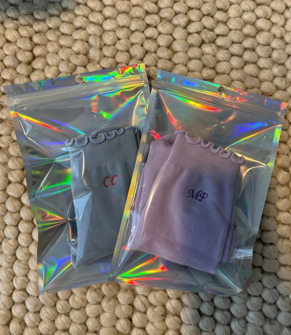 Custom initial embroidered ruffle grip sock