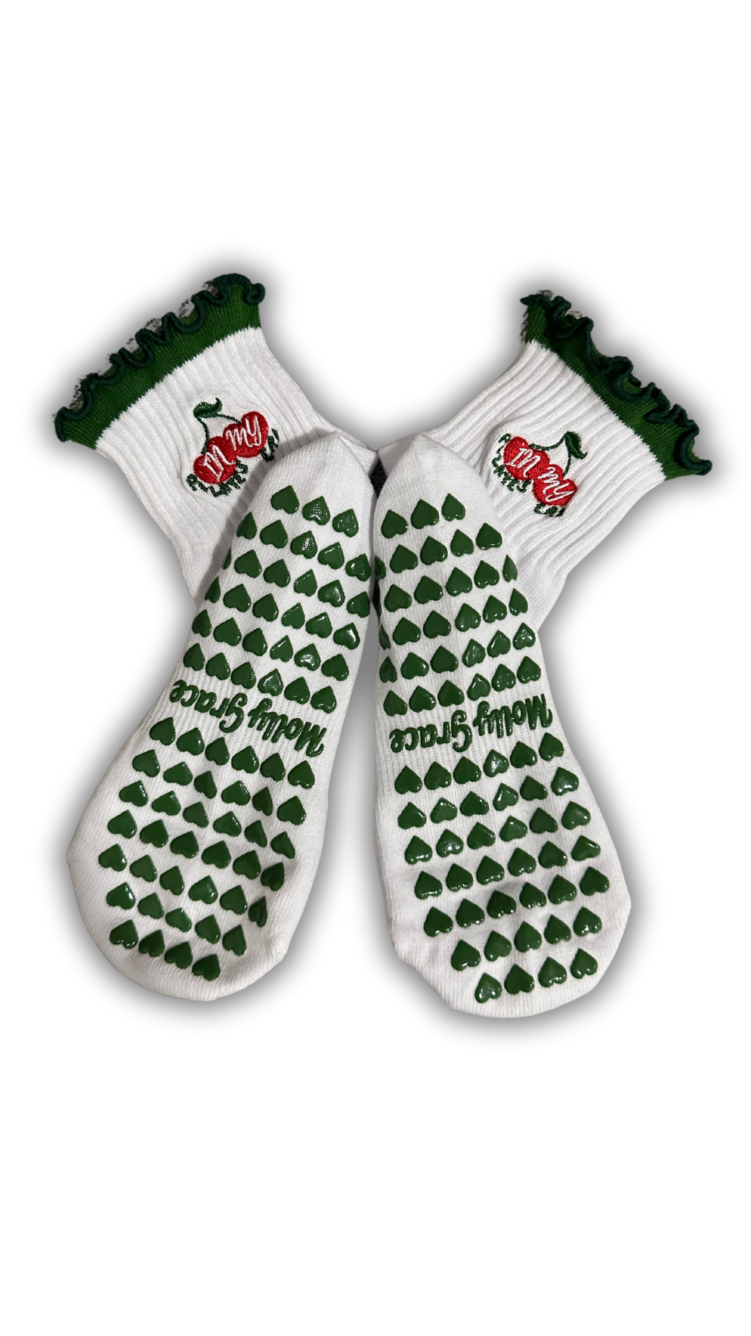 Step into your Pilates era with our elegant Grip Socks featuring a dark green ruffle trim and a charming, embroidered cherry detail. The "In My Pilates Era" script adds a playful, empowering touch, while the non-slip design keeps you grounded during every move. These socks blend style and functionality for your perfect Pilates practice!