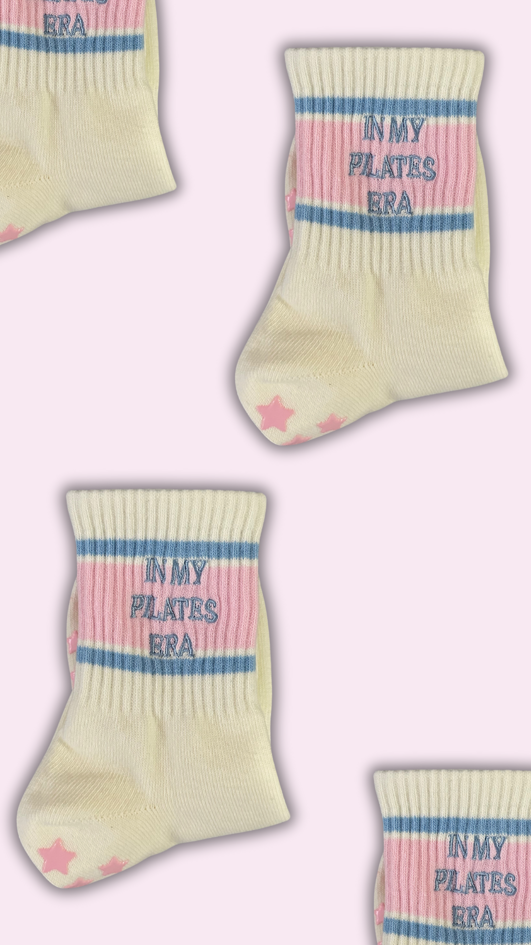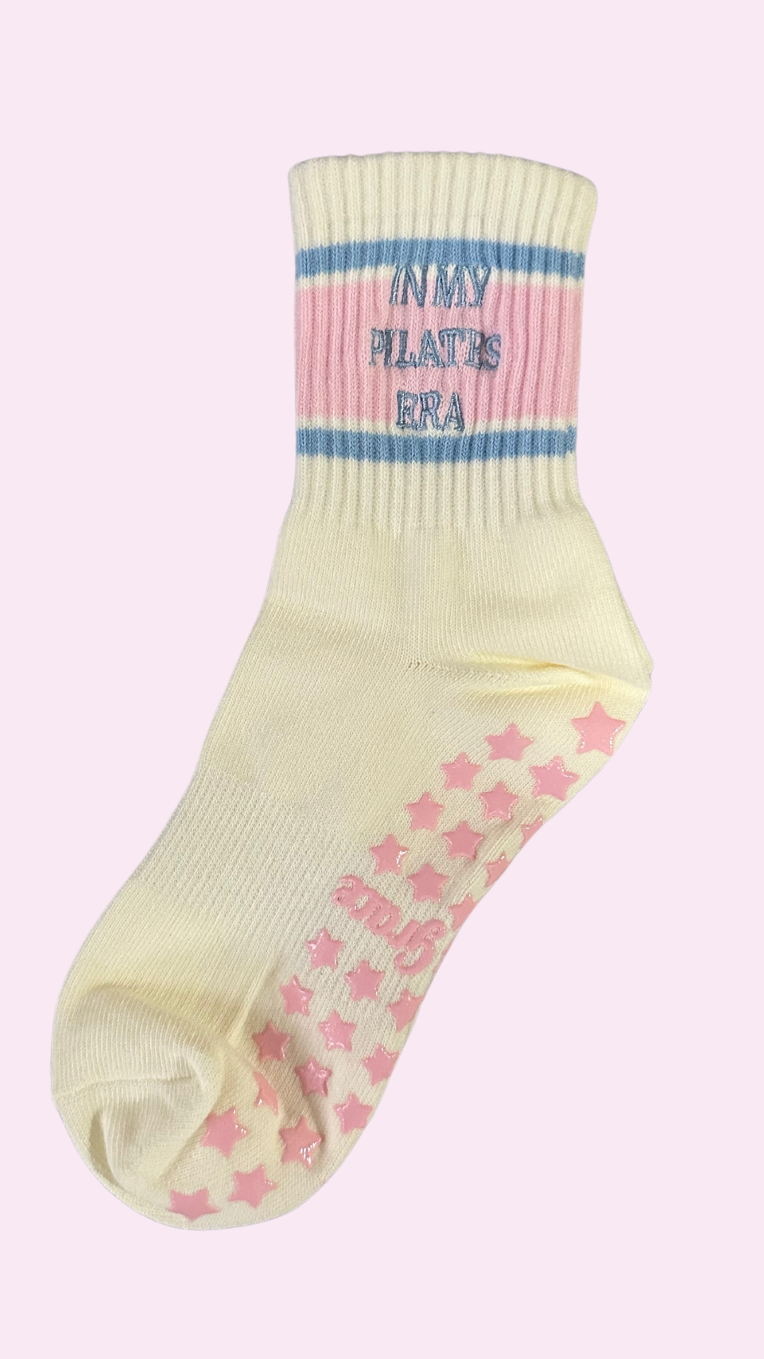 Introducing our Cream Grip Socks with playful pink and light blue stripes, designed for both style and stability. Featuring "In My Pilates Era" delicately embroidered, these socks also have charming pink star-shaped grips to keep you secure during every movement. Perfect for adding a fun yet functional touch to your Pilates sessions!