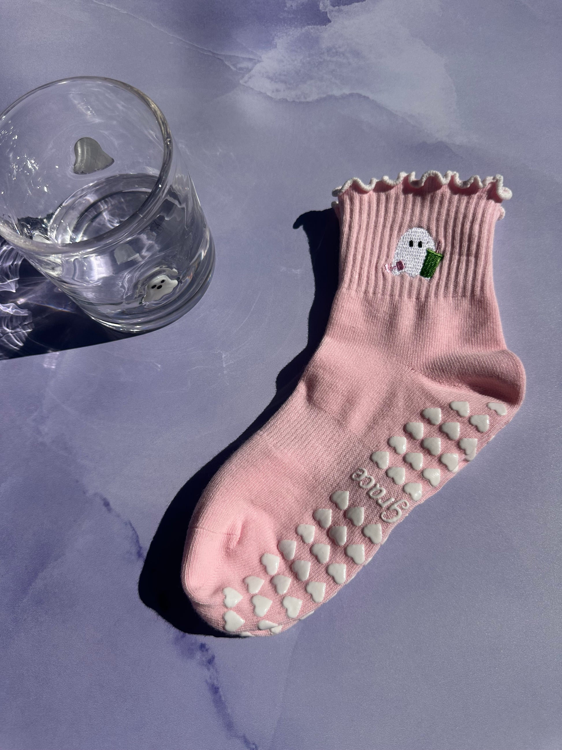 SPOOKY SEASON light pink ruffle Matcha ghost grip sock