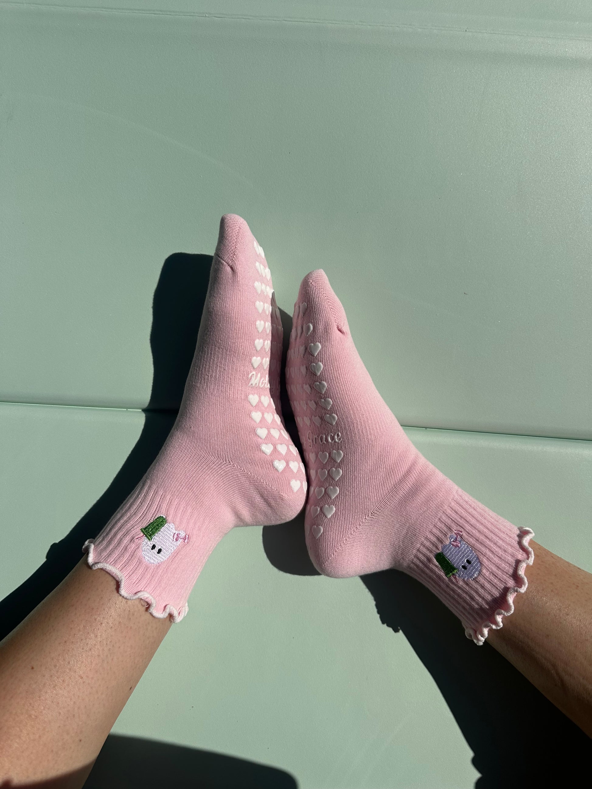 Add some playful charm to your workout with our light pink ruffle grip socks, featuring a ghost embroidered holding a matcha latte and a pink weight. Designed with non-slip white heart grips, these socks keep you secure during Pilates, barre, or yoga—while the ruffle detail and spooky-cute design bring extra personality to your practice. Cozy, functional, and fun.