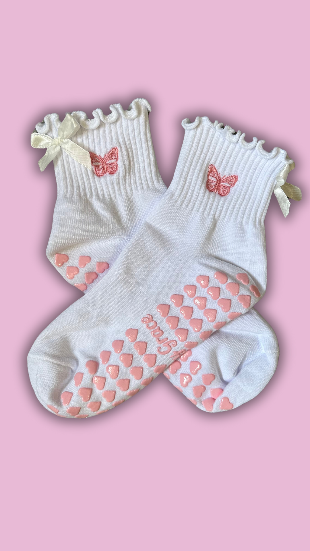 Step into charm with our White Ruffle Grip Socks, featuring a delicate white bow, a pink embroidered butterfly, and pink heart grips. Perfect for yoga, pilates, or lounging at home, these socks combine elegance and practicality. Made from soft, breathable fabric with a stylish ruffle detail, they ensure a comfortable and secure fit. Add a touch of whimsy to your routine or gift these delightful socks to someone special, enhancing every step with grace and comfort!