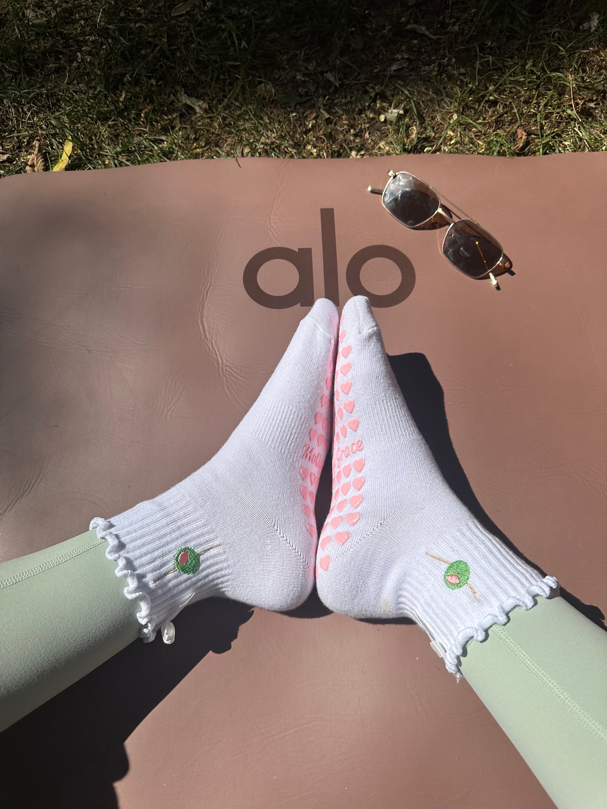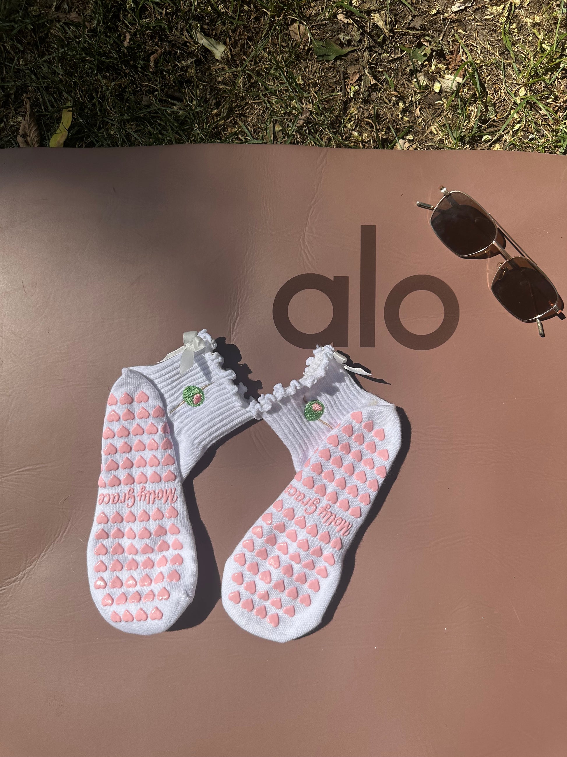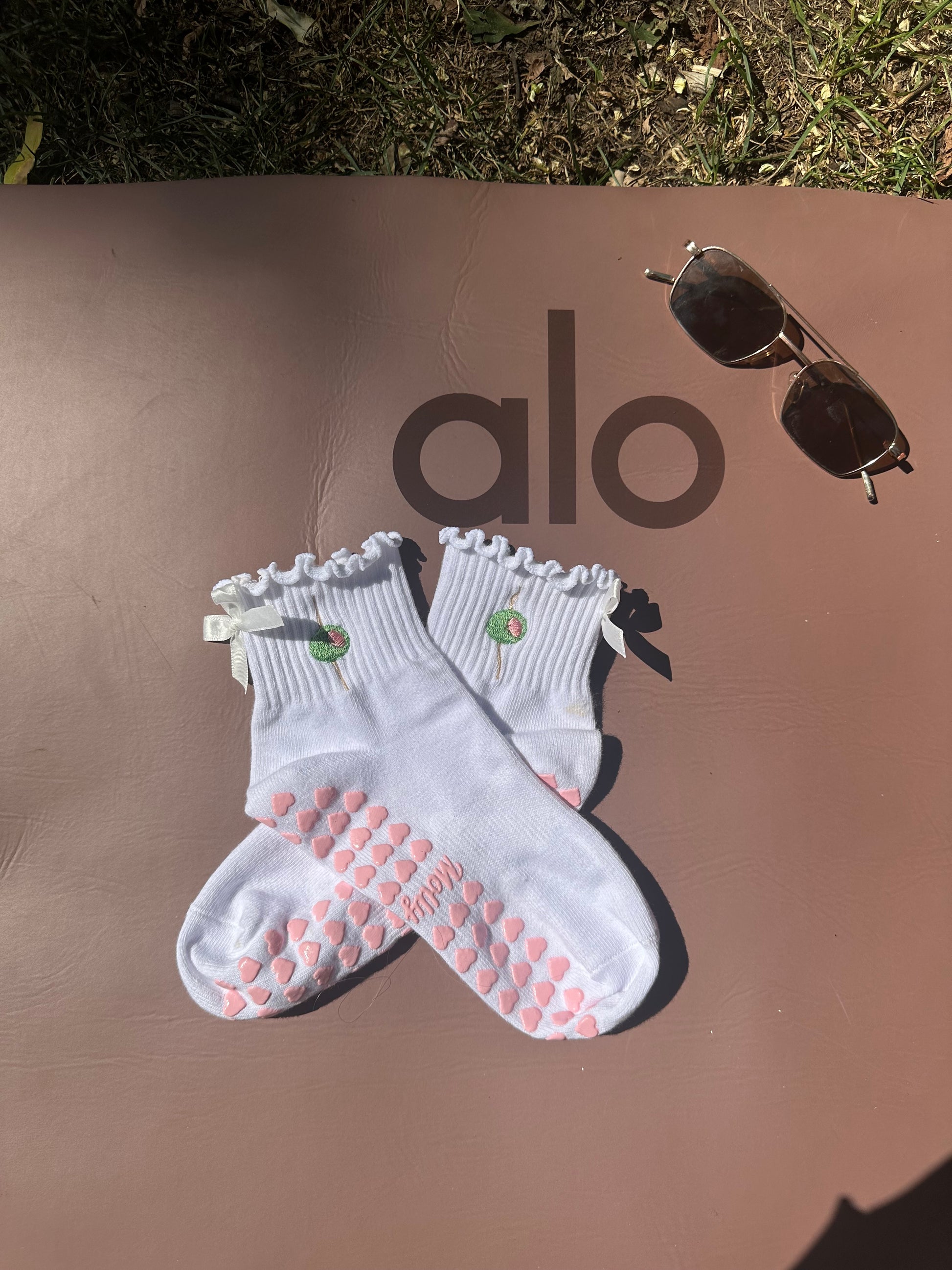 Elevate your comfort with our White Ruffle Grip Socks, featuring an adorable olive embroidery, a delicate white bow, and pink heart grips. Perfect for yoga, pilates, or lounging at home, these socks combine playful style with practical comfort. Crafted from soft, breathable fabric with a charming ruffle detail, they ensure a secure fit on any surface. Treat yourself or a loved one to these unique and whimsical socks, adding a touch of fun and elegance to your routine!